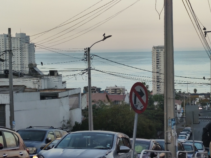 The image depicts an urban coastal scene in Iquique, Chile, viewed from an elevated perspective looking towards the Pacific Ocean under a pale, diffused sky suggesting late afternoon or early evening. In the immediate foreground, a line of vehicles is present. A dark-colored sedan's front is partially visible on the left. A silver sedan occupies the central foreground, partially obscuring a blue SUV behind it. To the right of the silver sedan, a red and white circular "No Right Turn" traffic sign is prominently displayed on a pole. The far right edge of the frame shows a partial view of a dark-clad individual, obscured by a utility pole. The mid-ground features multiple utility poles with a dense network of overhead power and communication lines crisscrossing the frame. A central utility pole supports a street lamp, on which two dark birds are perched. Another dark bird rests on a utility wire or rooftop to the left. Below the utility lines, various white, multi-story residential or commercial buildings with flat roofs are visible. One building on the left has a visible solar panel or water heater on its roof. A street slopes downhill to the right, lined with parked cars. In the background, the calm, light blue expanse of the Pacific Ocean spans the horizon. Two distinct tall, white, multi-story buildings rise on opposite sides of the frame, framing the ocean view. Sparse greenery and palm trees are visible closer to the horizon on the right.