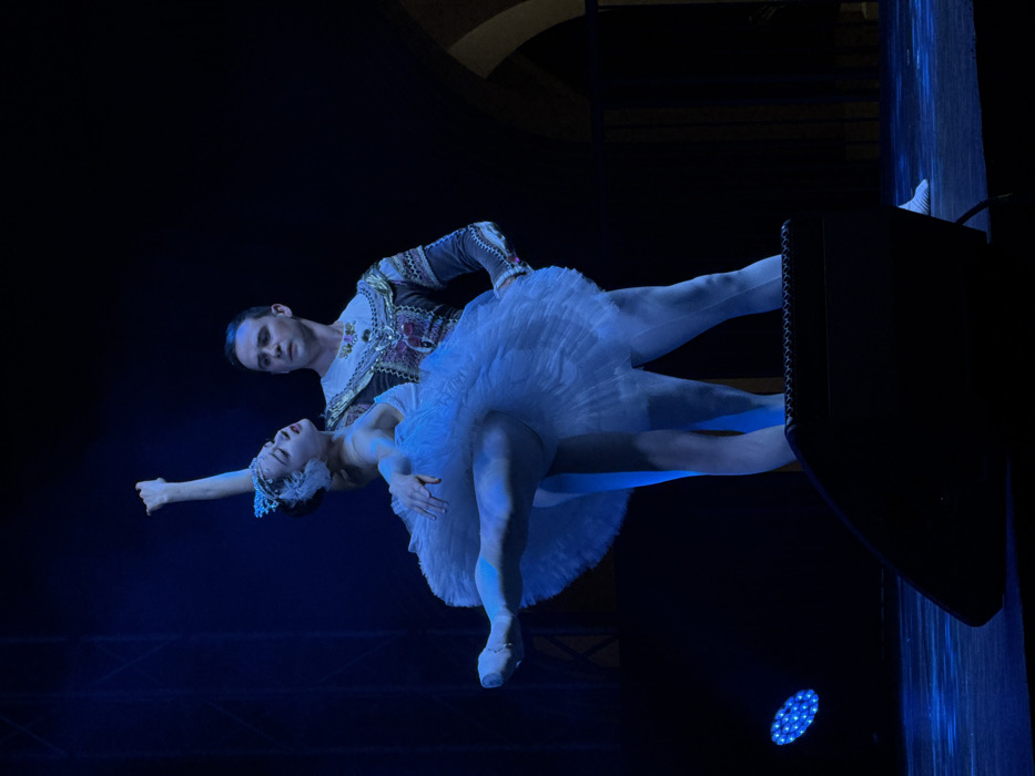 A male ballet dancer wearing a patterned white and grey top holds a female dancer in a dramatic pose. The woman, in a white tutu and tiara, arches backward, her arm extended. A blue light illuminates the scene. Parts of a speaker and what appears to be a stage background are visible on the right. The setting is a dark stage, likely a performance.