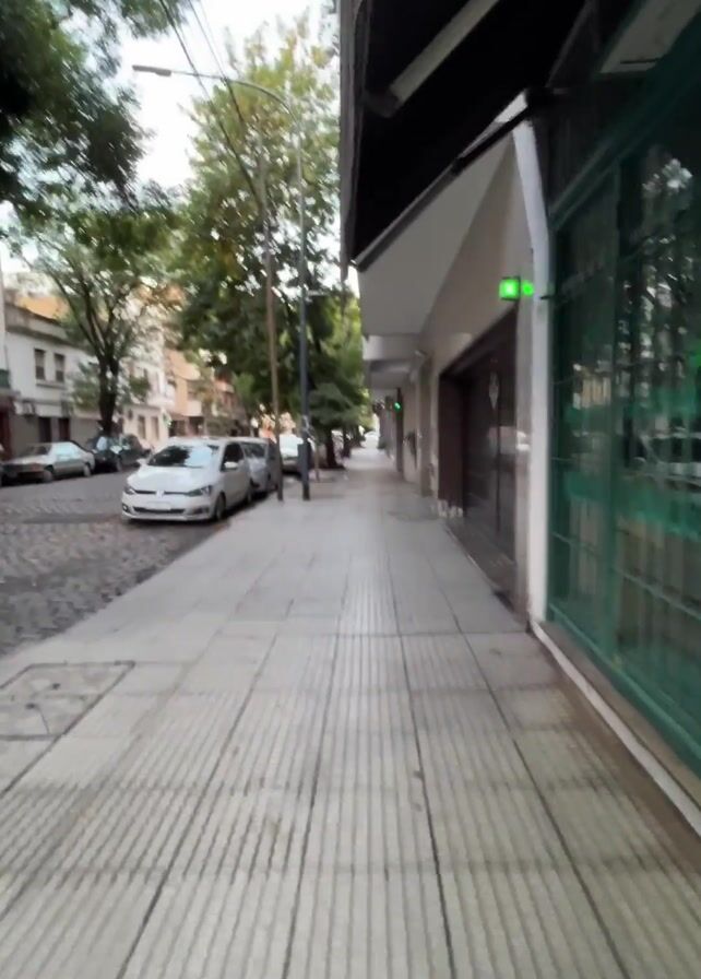 The camera moves forward at a low angle along a sidewalk in an urban environment. The sidewalk is composed of long, rectangular grey tiles. On the left of the frame is a street lined with parked cars and mature trees. Streetlights are interspersed amongst the trees. On the right side of the sidewalk are buildings, mostly with closed storefronts, some with awnings or metal gates. Around the halfway point in the video, a person is seen sitting on the edge of the sidewalk, under the overhang of a building. The day appears to be overcast, as the lighting is soft.