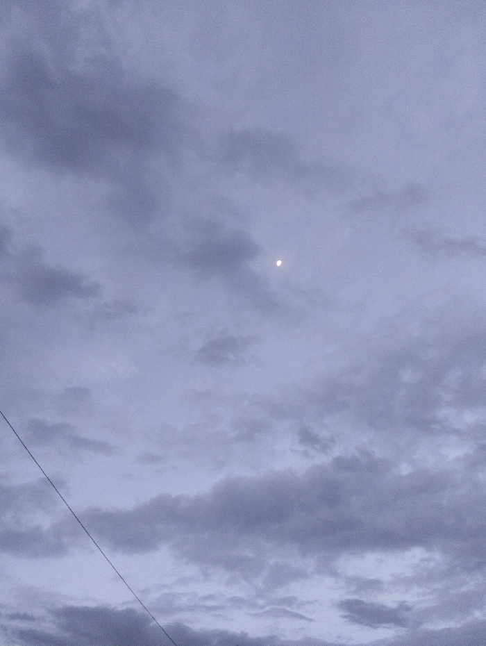 The image depicts an overcast sky over Witeithie ward, Kenya, at what appears to be either dusk or dawn. The sky is filled with a dense layer of clouds, primarily light grey and purplish-blue in hue. A distinct, bright white crescent moon is visible in the upper central portion of the frame, partially obscured by thinner cloud cover. A single, dark, thin linear object, consistent with an electrical or communication wire, runs diagonally from the lower-left corner upwards into the middle-left of the image. No ground features, structures, people, or discernible actions are visible within the frame, which is entirely dominated by the sky and its atmospheric conditions.