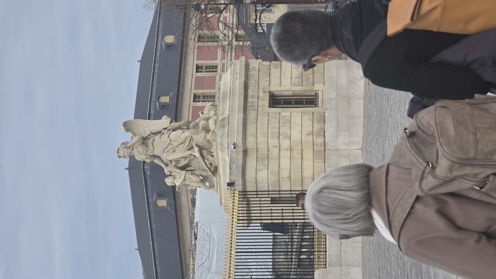This image captures a wide outdoor scene in the city of Versailles, France, specifically at the Place d'Armes in front of the Palace of Versailles. In the foreground, two individuals are seen from behind on a cobblestone surface. The person on the left has short, light gray hair, wears a brown coat, and carries a light brown backpack. The person on the right has dark, short hair, wears dark clothing, and carries an orange backpack; sunglasses are visible on the back of their head. A third person's head, featuring dark hair and glasses, is partially visible in the mid-ground between these two figures. The central subject is a large, multi-figure stone sculpture, "La France triomphante" by Antoine Coysevox, mounted on a substantial, light-colored stone pedestal. The primary figure is a winged, robed woman wearing a wreath, with smaller figures and an eagle at her base. The pedestal is constructed from large stone blocks, includes a small barred window on its visible side, and features two security cameras mounted on its upper edge. In the background, behind the statue and pedestal, is the ornate black iron Grille Royale (Golden Gate) of the Palace of Versailles, distinguished by its gilded spear-top ornamentation. Beyond the gate, architectural elements of the palace are visible, including dark grey mansard roofs with light-framed dormer windows, light stone facades, and sections of red brickwork with rectangular windows. Scaffolding covered in white sheeting is discernible on the far left. The sky above is uniformly overcast.