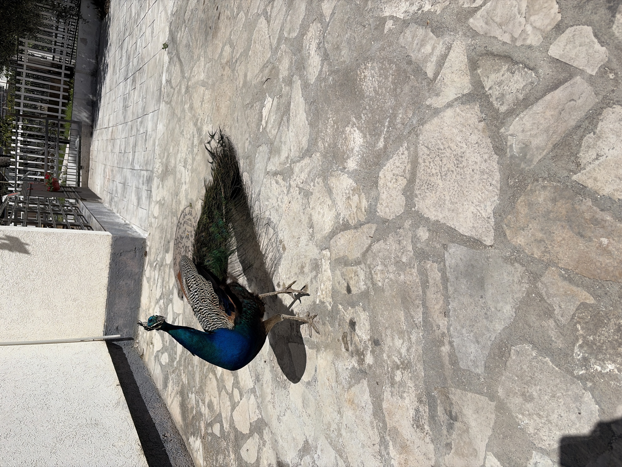 A peacock stands on a cracked stone patio in Bar, Montenegro