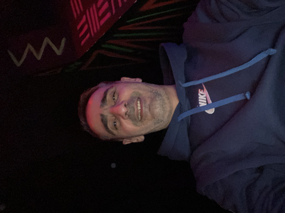 A selfie features a middle-aged man smiling, wearing a blue Nike hoodie with a pink logo and blue drawstrings. He has short hair and a light beard. The background is dark, with dimly lit geometric patterns in pink, green, and white visible in the top left corner. The overall lighting is poor, casting shadows across the man's face and obscuring details in the background. The image is rotated slightly clockwise.