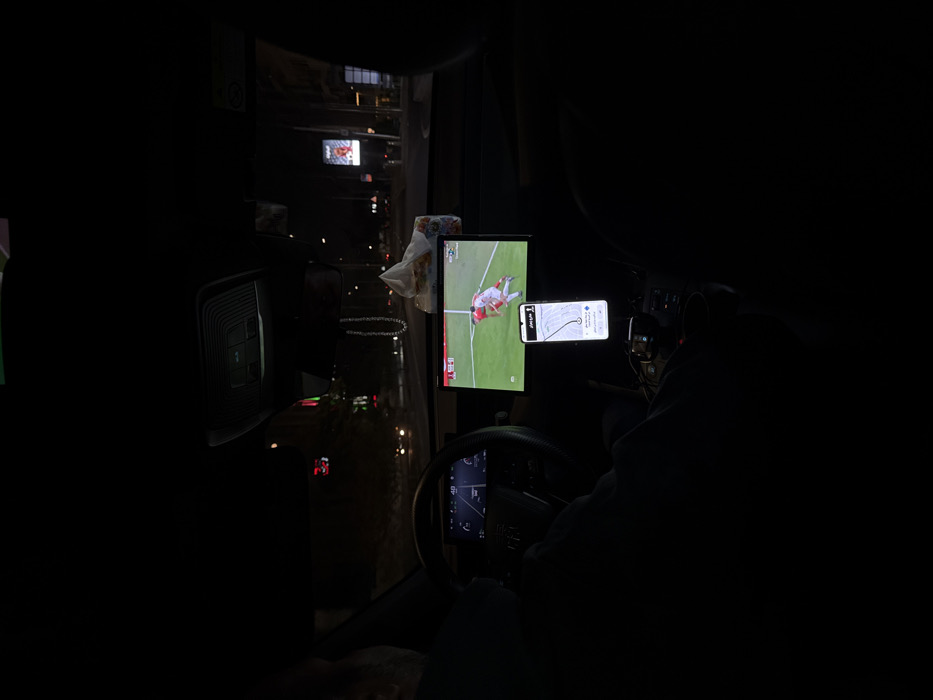 - "A dark interior shot from a driver's perspective shows a screen displaying a soccer game attached to the dashboard" by FM-E8HK12, licensed under CC BY 4.0
