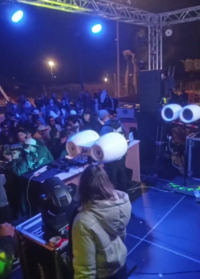 Here's a detailed description of the video: The video shows a night-time scene at what appears to be an outdoor event or concert. A DJ is on stage, visible behind a woman in a light-colored jacket who is near the front of the stage. A crowd of people is visible in the background, facing the stage. The stage is illuminated with blue stage lights. There are two large, white, cylindrical objects with open ends on the stage that resemble jet engines. A lighting system with green accents is positioned in front of the stage. The woman in the jacket is moving slightly, possibly dancing or enjoying the music. A person is standing to the right of the camera's point of view. The overall atmosphere suggests a lively outdoor music event.