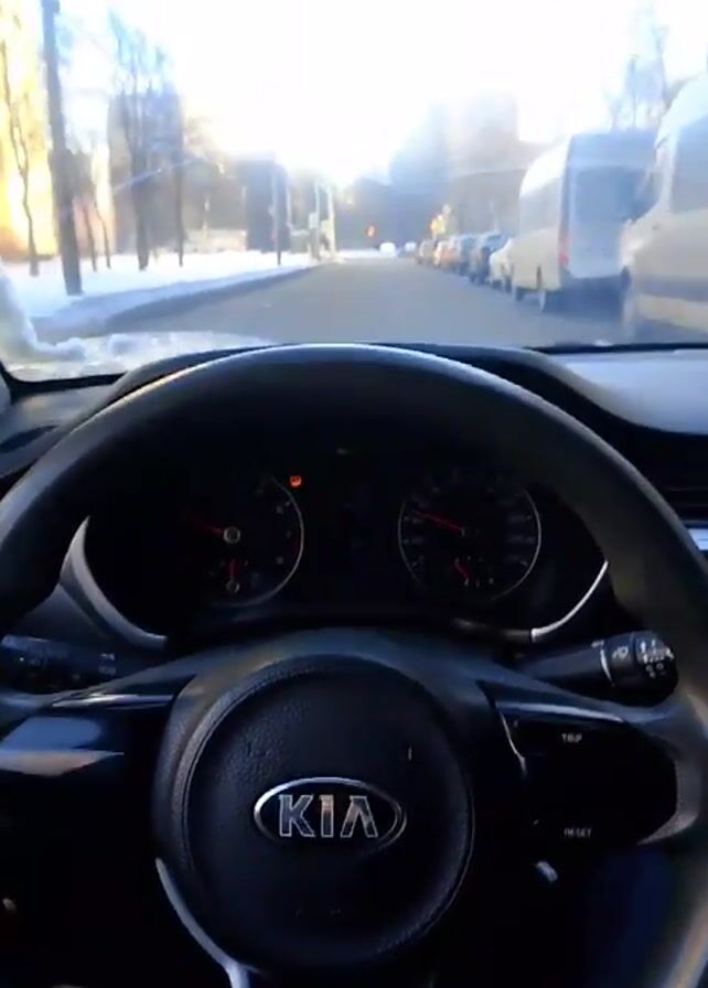 view from inside a Kia car. The car is driving down a street lined with parked cars on the right and snow along the sidewalks. The sun is shining brightly ahead, creating some glare. The dashboard and steering wheel are visible, with the Kia logo in the center of the wheel. The car appears to be moving slowly, likely due to traffic or conditions. The steering wheel is slightly tilted to the left.