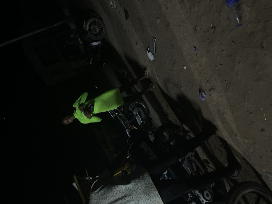 A woman in a bright green outfit stands beside a motorcycle in a dimly lit outdoor area. A crashed or tilted vehicle is visible in the background. Trash litters the ground including a plastic water bottle. The scene is dark with harsh shadows.