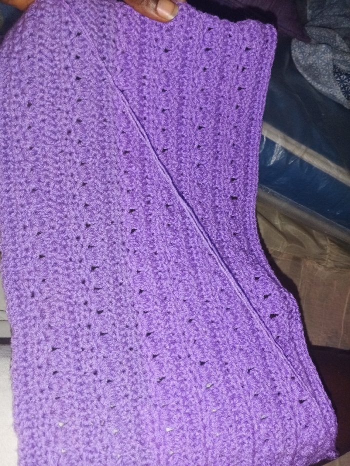 A close-up, oblique view shows a vibrant purple crocheted textile held by a person's dark-skinned thumb and forefinger at the top center. The fabric displays two distinct patterns: a denser, ribbed stitch on the right and a more open, lacy pattern with small, scattered apertures on the left, separated by a diagonal seam or fold. The background is blurred, revealing indistinct shapes consistent with an indoor environment in Nsukka, Nigeria, including a patterned blue and white fabric object and a dark, possibly plastic-covered item.
