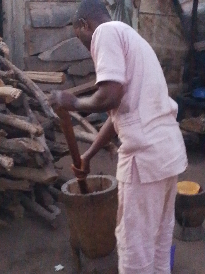 In an outdoor setting at Oduma Hill, Nigeria, a male individual is depicted from a slightly elevated side angle, engaged in a pounding action