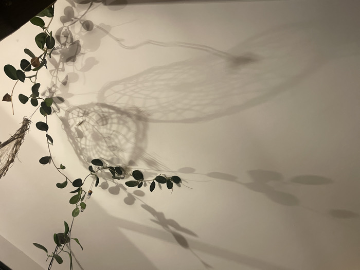 A climbing plant with small, round, dark green leaves is positioned near a white wall. The plant casts a distinct shadow on the wall, intertwining with the shadow of a hanging object, possibly a dreamcatcher. The dreamcatcher's shadow creates a complex, web-like pattern on the wall, contrasting with the simpler shapes of the leaves' shadows. The light source is positioned to the left, causing the shadows to stretch dramatically across the wall.