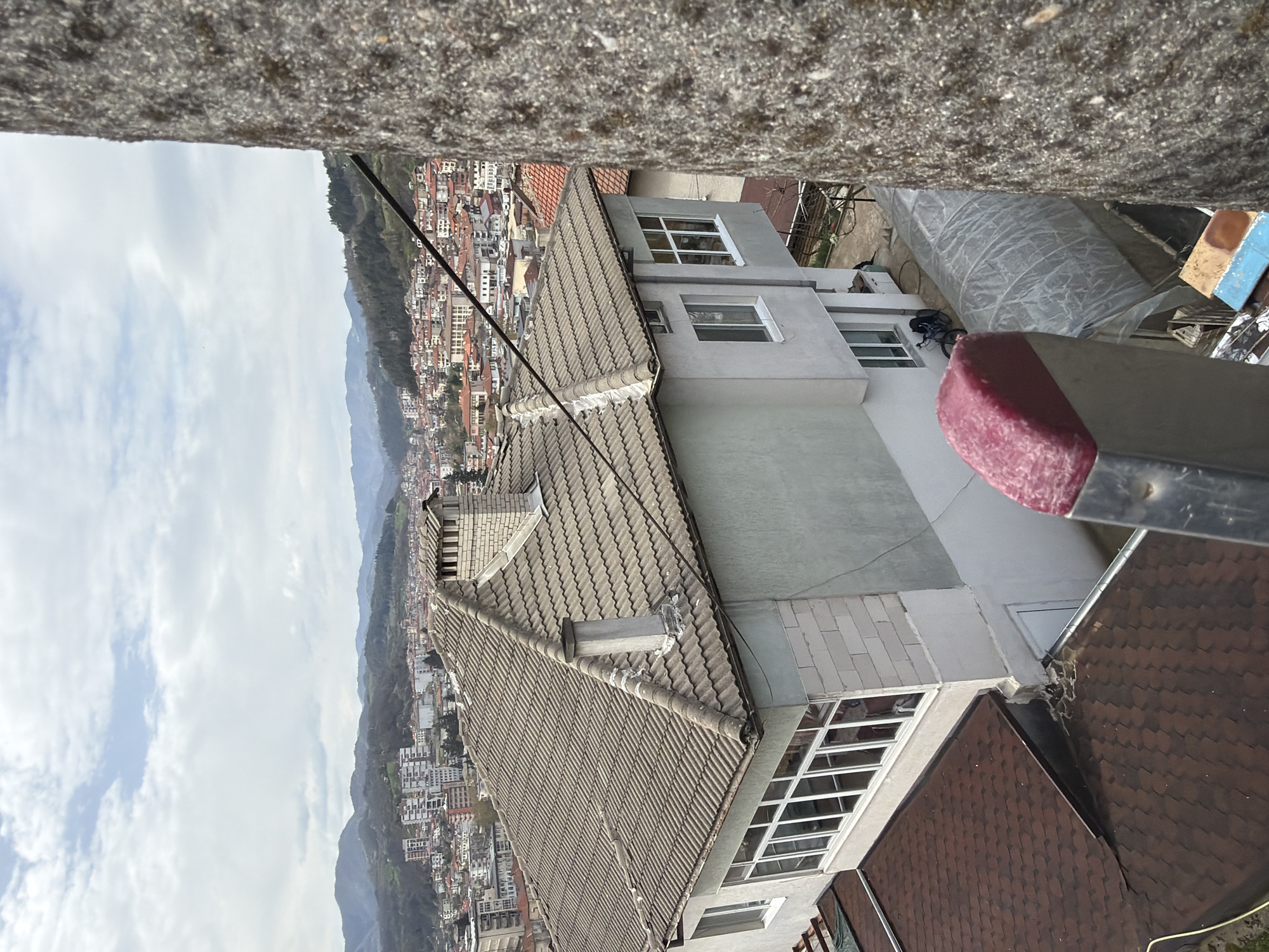 This high-angle shot presents an urban scene in Zlatograd, Bulgaria, possibly taken from an elevated position or rooftop. In the foreground, a section of a weathered concrete structure frames the top of the view. The primary focus is on a two-story building, partially under construction. The building features a grey exterior and white-framed windows. Adjacent to this, a section of another building with a brown-tiled roof is visible. Beyond the buildings, a densely populated area sprawls across the landscape, characterized by buildings of varying heights and colors. Hills and mountains form a backdrop, with a cloudy sky above. A wire is visible across the frame. A ladder with a pink tip sits in the bottom right corner.