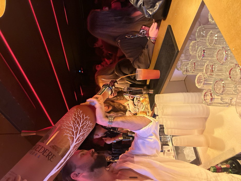 The scene depicts a bar interior in Barcelos, Portugal, characterized by dim lighting and prominent red LED strips on a dark ceiling. A male bartender with a short beard, wearing a light-colored shirt, is actively pouring a drink. He holds a large bottle of Belvedere Vodka, adorned with a white tree design, inverted with both hands, directing liquid from a smaller pour spout attached to its neck into a translucent plastic cup containing an orange-red beverage. The cup rests on a black rubber bar mat on a light-colored counter. Nearby, stacks of clear plastic cups and inverted glass tumblers are arranged on the counter. Various bar tools, including a metal jigger, are visible. In the midground, several patrons are present; a female with long dark hair, wearing a dark top and carrying a phone with a pink case attached to a strap, is visible on the right, facing the bar. Another female with lighter, wavy hair is partially visible behind the bartender's arm. The overall environment suggests a lively, crowded nightlife venue.
