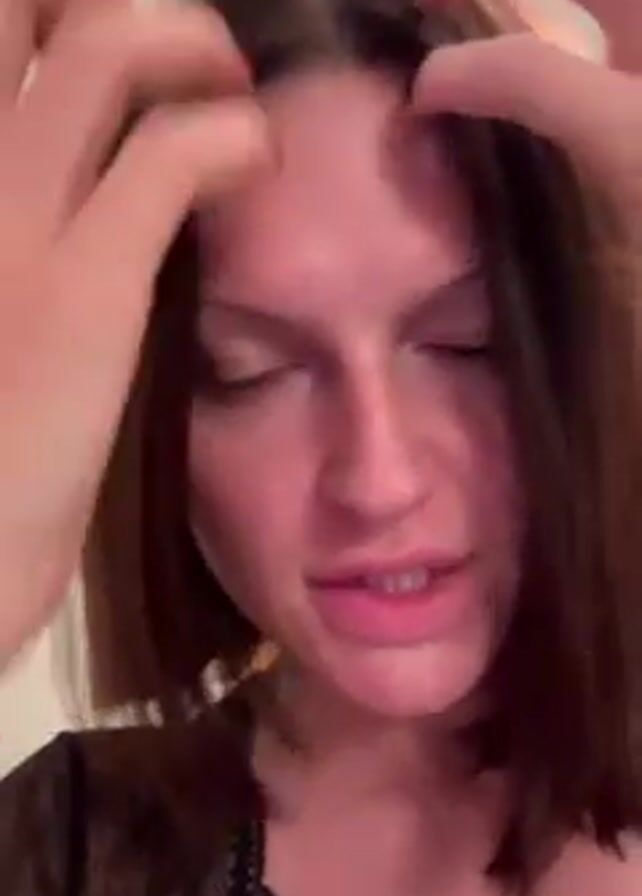 The video features a woman with medium-length brown hair. She is wearing a black lace top. She is looking directly at the camera, and then shifts her hair. The background is a plain white wall with a shelf in the background. The shelf contains various bottles. The lighting is soft.