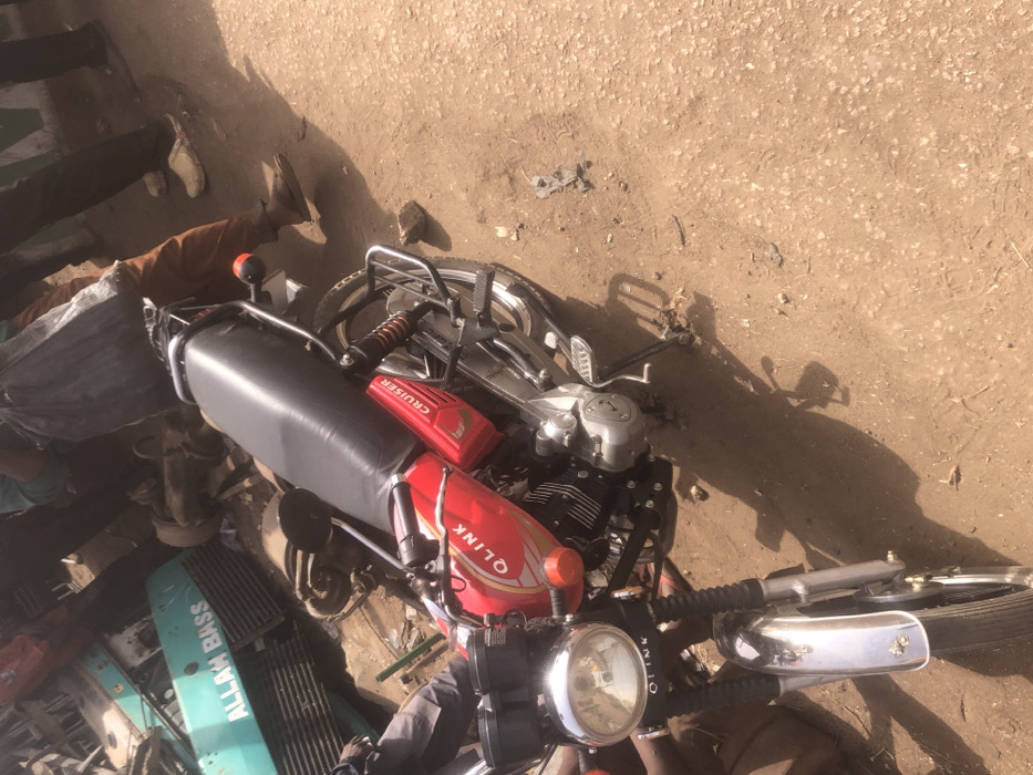 The image displays an outdoor scene in Kufena, Nigeria, characterized by a reddish-brown dirt ground under strong sunlight. The primary subject is a red and black Q LINK CRUISER motorcycle, positioned diagonally across the frame. Its red fuel tank bears "Q LINK" branding, and "CRUISER" is visible on a red side panel. The motorcycle features a black seat, chrome front fender, round headlight, and a functional appearance. In the background, to the left and rear of the motorcycle, a cluttered area contains various mechanical components and scrap metal. A large, teal-colored machinery part with "ALLAH BASS" written in white lettering is prominent. Several individuals are partially visible in the background, mostly from the waist down, standing on the dirt surface. One person in light brown pants and dark footwear is seen near the rear of the motorcycle, holding a dark bag. No specific actions or interactions among the individuals are clearly discernible. The environment suggests a roadside workshop or an area handling vehicle and machinery parts.