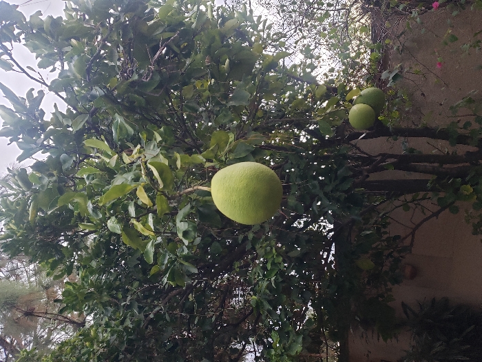 A tree laden with green, round fruits dominates the scene. Three of these fruits are prominently visible, hanging from the branches amidst dense foliage. The tree's leaves are a mix of light and dark green, creating texture. Adjacent to the tree, a building with climbing vines is visible. The overall impression is one of lush greenery and natural abundance.