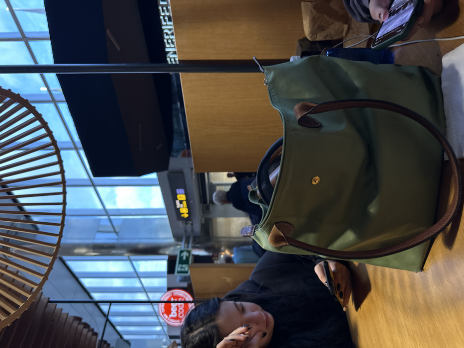 A young woman with long dark hair is sitting at a wooden table in a large, modern, brightly lit space. She is wearing a black hooded sweatshirt and is looking down at a smartphone in her hands. She is sitting on the right side of the table. A large, green tote bag is sitting on the left side of the table. The bag is made of nylon and has leather straps and handles. In the background, there are large windows that look out onto a bright, sunny day. There are several other people walking around in the space. The space looks like a modern airport terminal, likely in the Tenerife South Airport, located in the city of Granadilla de Abona, Spain, at the coordinates 28.048 latitude, -16.578 longitude. The woman is likely waiting for a flight.