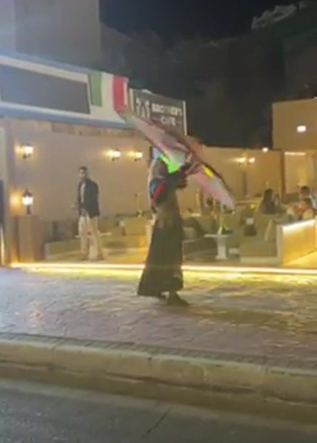 man performing a traditional dance outside a cafe at night. The man is dressed in a long black coat, white headdress, and colorful embroidered vest, and he is spinning a large colorful piece of cloth. The cafe, called "Brother's Cafe," has a modern outdoor seating area with plush couches, low tables, and hookahs. A flat screen TV is visible, displaying a soccer match. A man in a blazer and pants is standing on the sidewalk, watching the dancer. Other patrons are seated in the outdoor area of the cafe. The area is lit by outdoor lights. The video appears to be recorded from a static position across the street.