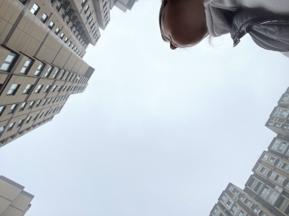 A low-angle shot captures a person's face and shoulders against a backdrop of tall buildings under an overcast sky. The buildings are boxy with numerous windows and appear to be modern residential structures. The sky is a pale gray, suggesting fog or heavy cloud cover. The viewpoint is unusual, with the buildings and sky framing the person's face from below. The clothing worn is casual, possibly a jacket or vest over a lighter top.