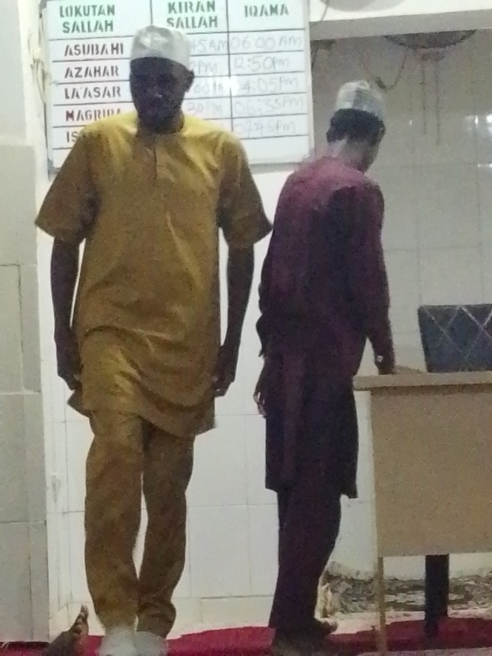 Two men, both wearing taqiyah caps, stand inside a mosque. One man, positioned to the left, is dressed in a matching yellow top and pants, and white shoes. The second man, partially obscured, wears a maroon outfit and dark shoes. A board displays the prayer times for Lokutan Sallah, Kiran Sallah, and Iqama. The mosque interior is visible, including white-tiled walls, a lectern-like structure, and a glimpse of the prayer rug.