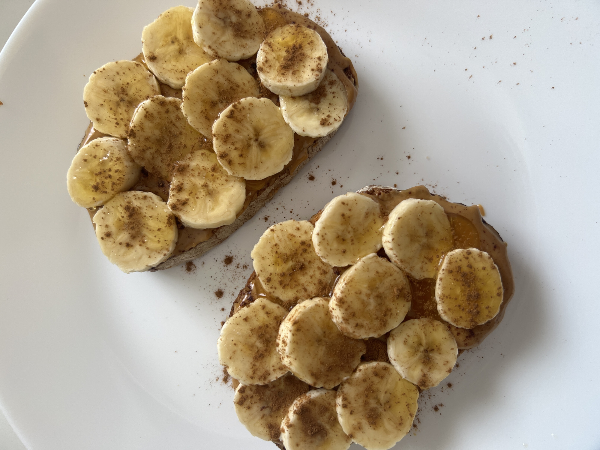 The image displays two pieces of toasted bread, each generously topped with a light brown, creamy spread, consistent with peanut butter. Both pieces are uniformly covered with circular slices of ripe banana, many showing subtle brown spots. A fine dusting of dark brown powder, resembling cinnamon, is sparsely distributed over the banana slices and exposed areas of the spread. Additionally, a clear, glistening liquid, consistent with honey or syrup, is visibly drizzled over the entire topping. The food items are centrally arranged on a plain white, possibly ceramic, plate, which serves as a clean, minimalist background. The scene is brightly and evenly lit. No individuals are present, nor are any explicit actions or complex interactions depicted beyond the static presentation of the food. This scene is located in Mogán, Spain.