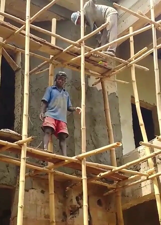 Two men are working on a multi-level bamboo scaffolding structure erected against a building under construction