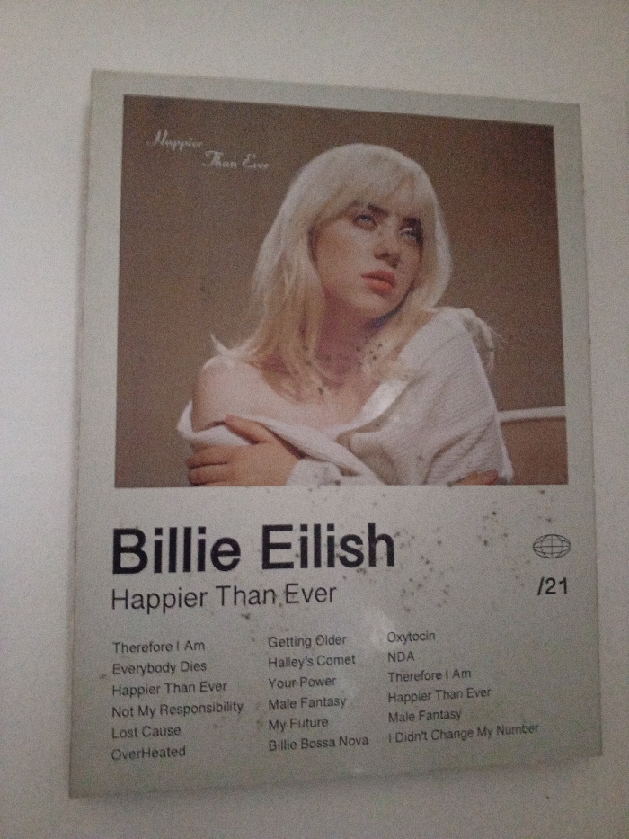 - "A vertically oriented rectangular poster, depicting the album cover for Billie Eilish's "Happier Than Ever," is affixed to a plain, off-white wall in the city of Unknown, Indonesia" by FM-KAoxu1, licensed under CC BY 4.0