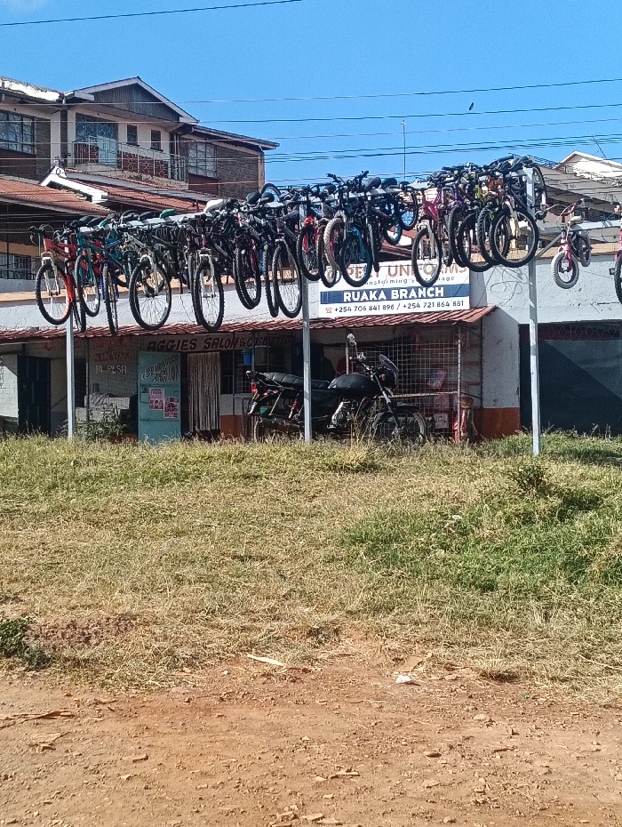 The scene depicts an exterior view in Ndenderu ward, Kenya, under a clear blue sky. In the foreground, an unpaved, reddish-brown dirt surface with scattered small stones transitions into a strip of dry and green grass. The midground features a large, horizontal metal rack, supported by white vertical poles, from which approximately 30-40 bicycles of various models and sizes are suspended. Behind this bicycle display is a single-story commercial building with a corrugated metal roof. A prominent blue and white sign on the building's facade reads "OPEN UNIFORMS RUAKA BRANCH" followed by phone numbers +254 706 841 896 and +254 721 864 881. To the left, a partially obscured sign indicates "AGGIES SALON & COSMETIC". Two dark-colored motorcycles are parked on the ground in front of the building, beneath the hanging bicycles. In the background, a multi-story building with a brown corrugated roof and multiple windows is visible. Overhead, several utility wires are strung across the frame. No individuals are present, and no specific actions or interactions are depicted.