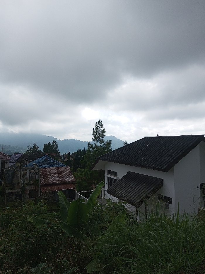 The image depicts a residential area in Kondha, India, under an overcast sky. A prominent white house with a dark tiled roof occupies the right foreground and mid-ground, featuring a smaller, dark-tiled awning over a lower section. To its left and extending into the mid-ground are several other residential structures, including one with a blue-tiled roof and another with a reddish-brown corrugated metal roof, some appearing weathered or partially derelict. Dense green vegetation, including tall grasses, bushes, and banana leaves, occupies the immediate foreground and surrounds the buildings. A tall, slender pine tree stands between the houses and the distant mountains. The background features rolling mountains partially obscured by low-hanging clouds. No individuals are visible. The lighting is diffused, consistent with a cloudy day.