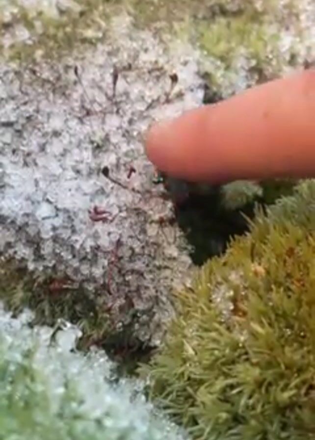 The camera focuses on moss, some of which is covered in melting snow. A finger pokes at the snow-covered moss. There are also thin, brown, stalk-like growths protruding from the moss, with small, darker capsules at the end. The environment seems cold and damp, evidenced by the melting snow and dew on the moss.