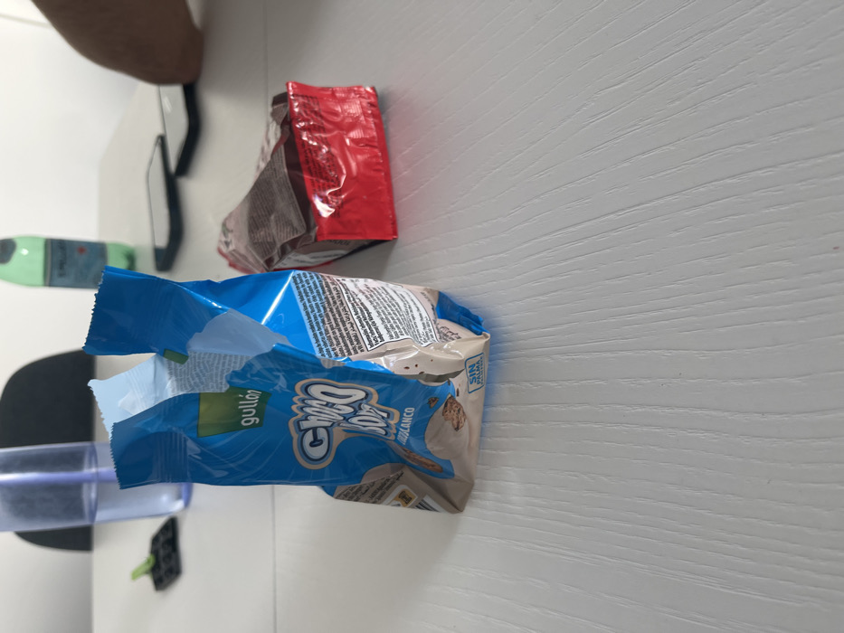 The scene depicts a light-colored, textured table in an indoor setting within València, Spain. In the foreground, a blue and white plastic bag, identified as "Gullón CHOCO 30% BLANCO SIN PALMA" (indicating biscuits), stands upright but is visibly crumpled and open at the top, suggesting partial consumption. To the right and further back, a crumpled red plastic bag lies on its side. The background features several items on the table: a clear plastic water bottle with a blue lid and straw on the far left, a small black object with a green clip, two black smartphones placed screen-down, and a green bottle of San Pellegrino sparkling water on the right. A dark chair back is partially visible behind the water bottle on the left, and a blurred human arm is partially visible on the far right of the frame, suggesting the presence of at least one individual. The environment appears to be an office or casual meeting space.