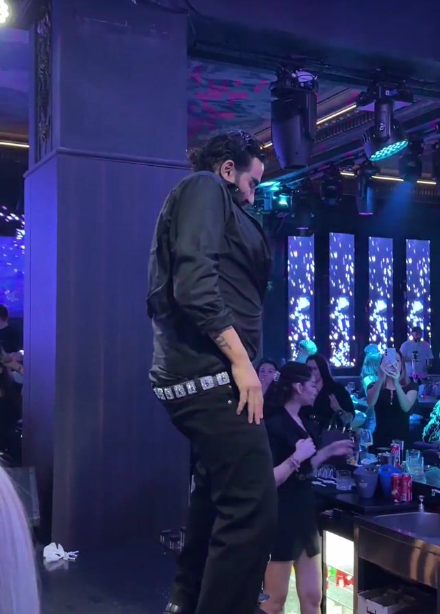 A man in a black button-down shirt and black pants with a large silver belt dances on a bar counter