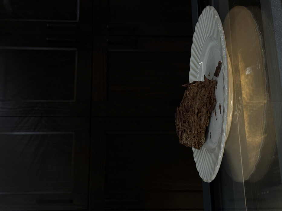 - "A piece of chocolate cake sits on a white plate, which is partially visible due to the dark, almost black background created by a wooden cabinet" by FM-Wzevo2, licensed under CC BY 4.0