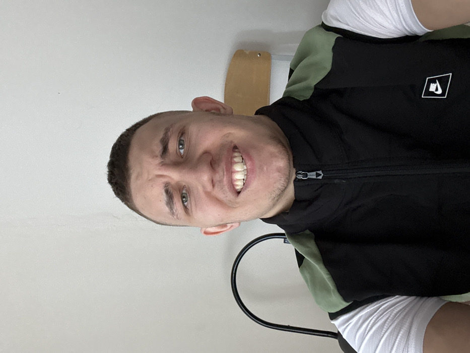 A man smiles at the camera. He is fair-skinned with short, light brown hair and green eyes. He wears a black and light green jacket with a white logo on the chest, over a white t-shirt. The background includes a white wall, a wooden object, and a black object possibly a chair.