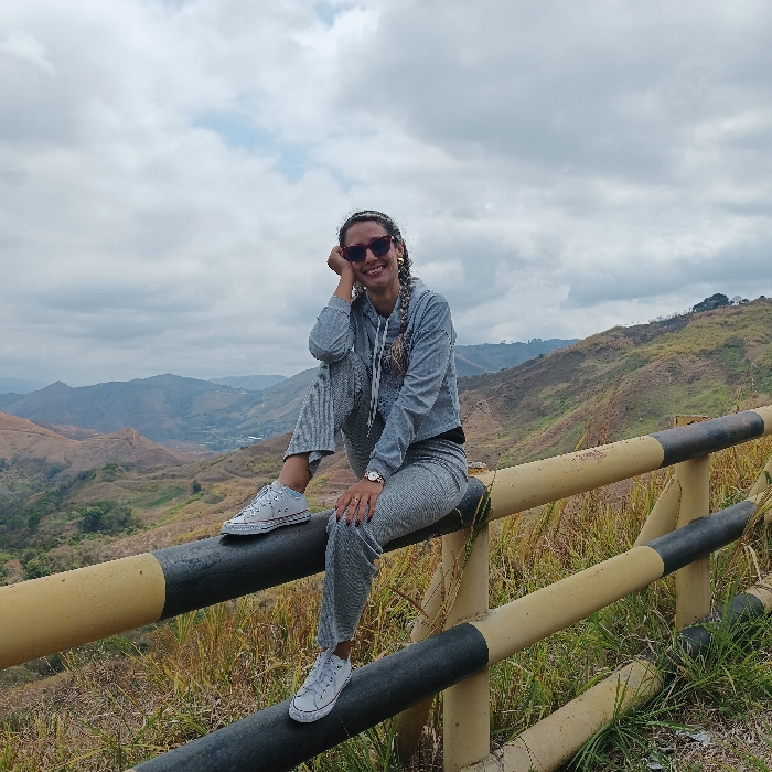 A single female subject is observed positioned centrally in an outdoor, elevated landscape. She is seated casually on a metal guardrail, which is painted with alternating yellow and black stripes and extends horizontally across the lower half of the frame. The subject is wearing a grey hooded cropped sweatshirt over a black top, grey striped track pants, and white low-top sneakers. She has dark hair styled in braids and is wearing red-framed sunglasses. Her right hand is raised towards her head, and she is smiling, looking directly at the viewer. A watch is visible on her left wrist and rings on her right hand. The background consists of multiple layers of mountainous or hilly terrain covered with dry, sparse vegetation and scattered trees, under an overcast sky. In the middle distance, a settlement with buildings and structures is visible within a valley, indicating a populated area consistent with the city of Sabaneta, Venezuela.
