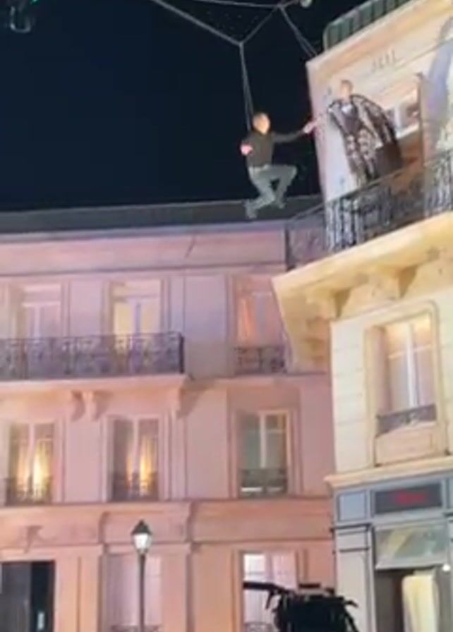 filming scene with two figures suspended in the air on wires against a backdrop of a building facade at night. One figure, clad in a dark outfit, dangles freely while the other, adorned in a patterned outfit, seems to be grabbing onto their arm. Both are suspended by wires connected to a crane above. In the foreground, an individual in a dark jacket and beanie can be seen partially, along with filming equipment. The backdrop features a building with balconies, windows, and architectural details, with a store sign visible on the ground floor. The scene is illuminated by artificial lights, and several crew members appear to be present.