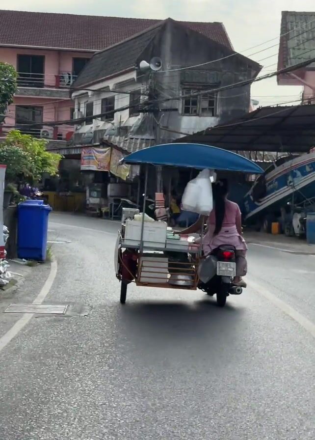 A woman driving a motorcycle with a cart attached moves down a street lined with buildings on both sides in an urban setting. The cart is covered by a blue umbrella and is filled with white containers. The woman is wearing a pink dress and has a white bag hanging from her head and neck. Other motorbikes pass in the opposite direction, and a few pedestrians are visible on the sidewalk. The day is overcast, and the pavement is wet. Power lines crisscross above the street. A sign in Thai is visible on the left.