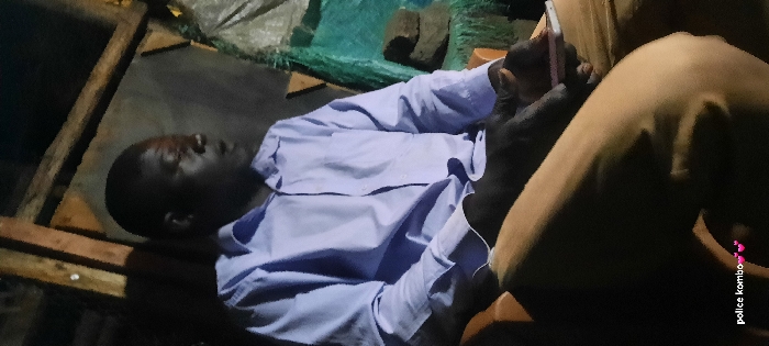 An unconscious man lies on a makeshift wooden structure, wearing a light blue shirt. He appears to be Black. A person wearing a tan shirt sits beside him, partially visible. The scene is dimly lit. Some green netting and other debris are in the background. The words "police kombo" are printed in pink in the lower right corner.