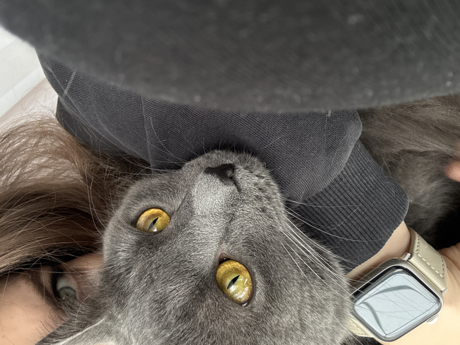 - "The image depicts a close-up scene occurring indoors in Прикамский, Russia, featuring a grey cat and a partial view of a person" by FM-oYDji2, licensed under CC BY 4.0