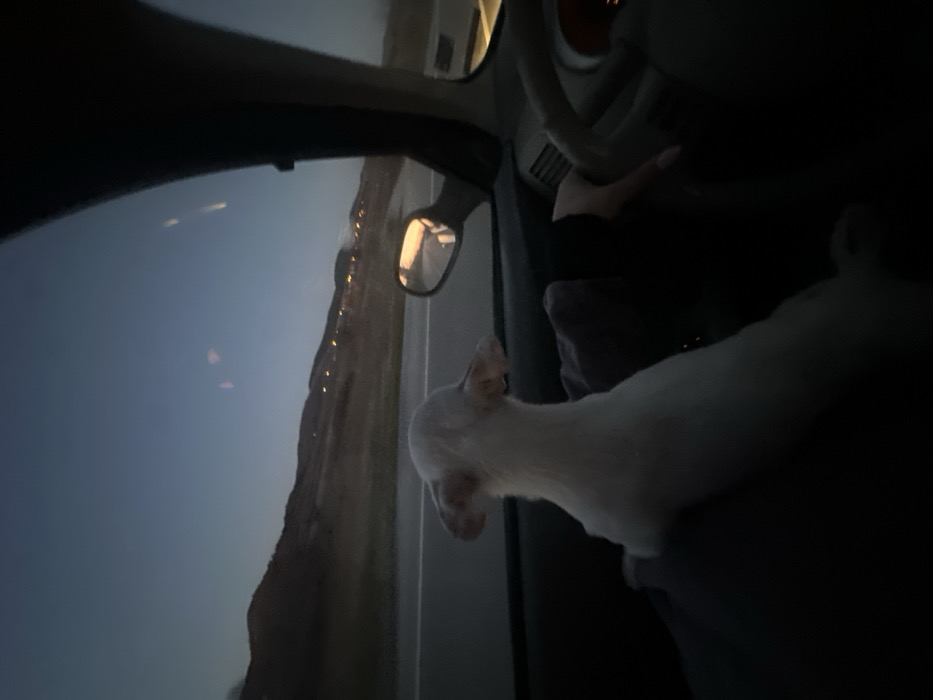 The scene is observed from inside a vehicle, facing forward at dusk or early night in Sotirya, Bulgaria. A small, white-furred dog, its back to the viewer, is positioned upright in the lower-left to mid-left frame, looking out the windshield. The dog has prominent, erect ears. To the right, a human's right hand, with light-colored, painted fingernails, is visible on the steering wheel, indicating a driver. The vehicle's dashboard, steering wheel, and a passenger-side mirror reflecting the twilight sky are visible. Outside the vehicle, a wide, paved road or highway extends into the distance. Beyond the road, dark hills or mountains rise under a deep blue-grey sky. A line of distant artificial lights, indicative of a settlement or streetlights, is visible along the base of the hills on the horizon.