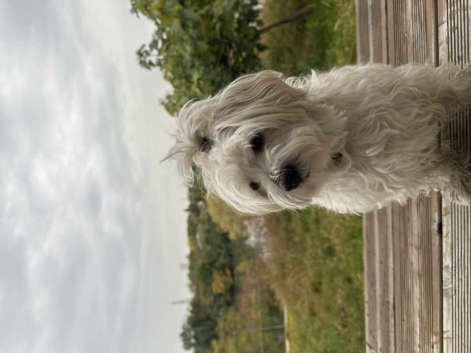 - "A small, white, long-haired dog, likely a Maltese, is seated upright on a light-colored wooden deck, centered in the frame" by FM-noBUi2, licensed under CC BY 4.0