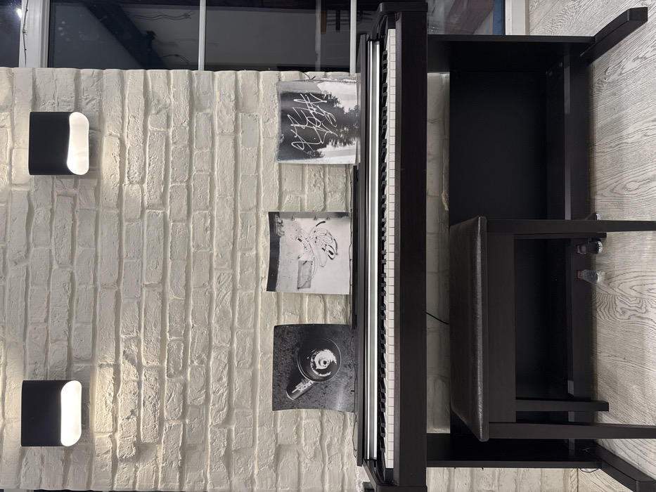 A white brick wall features two modern black sconces. Adjacent, a black digital piano stands, adorned with three black and white art prints. The prints show abstract scribbles, a banana, and a coffee cup. To the right of the piano, a black piano bench with a padded seat is visible, along with the piano stand and a glimpse of wooden flooring.