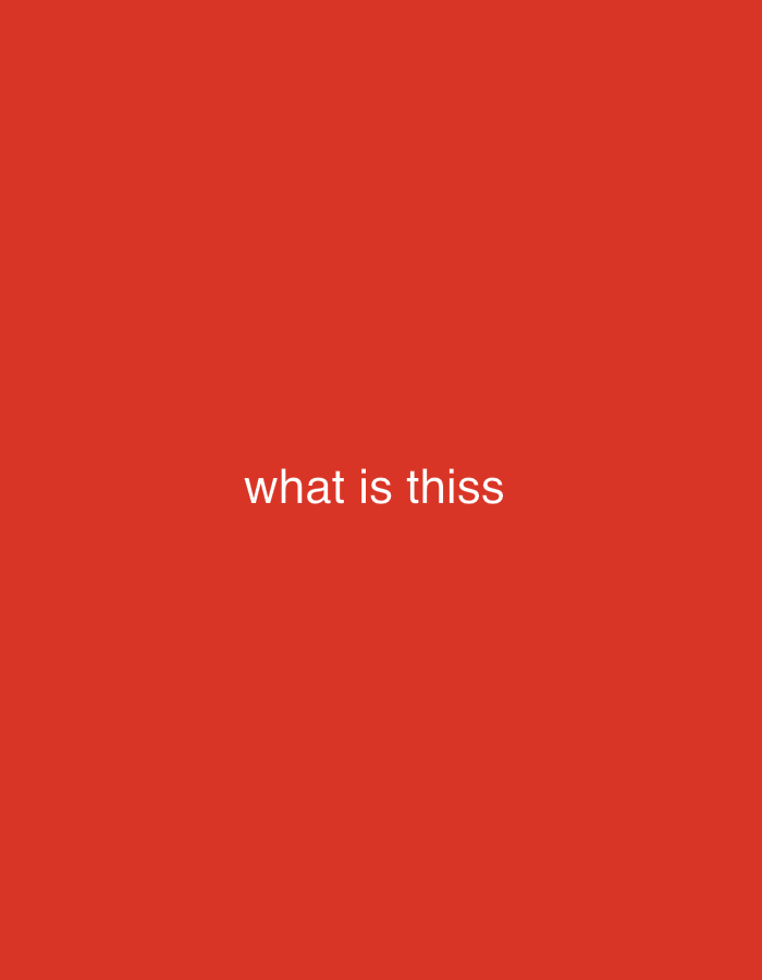 The image displays a two-dimensional digital graphic with a uniform, solid red background. Centered horizontally and slightly elevated from the vertical mid-point is the phrase 'what is thiss' rendered in white, sans-serif typeface. No other individuals, objects, or environmental features are present. This digital scene is presented as being located in Shkorpilovtsi, Bulgaria.