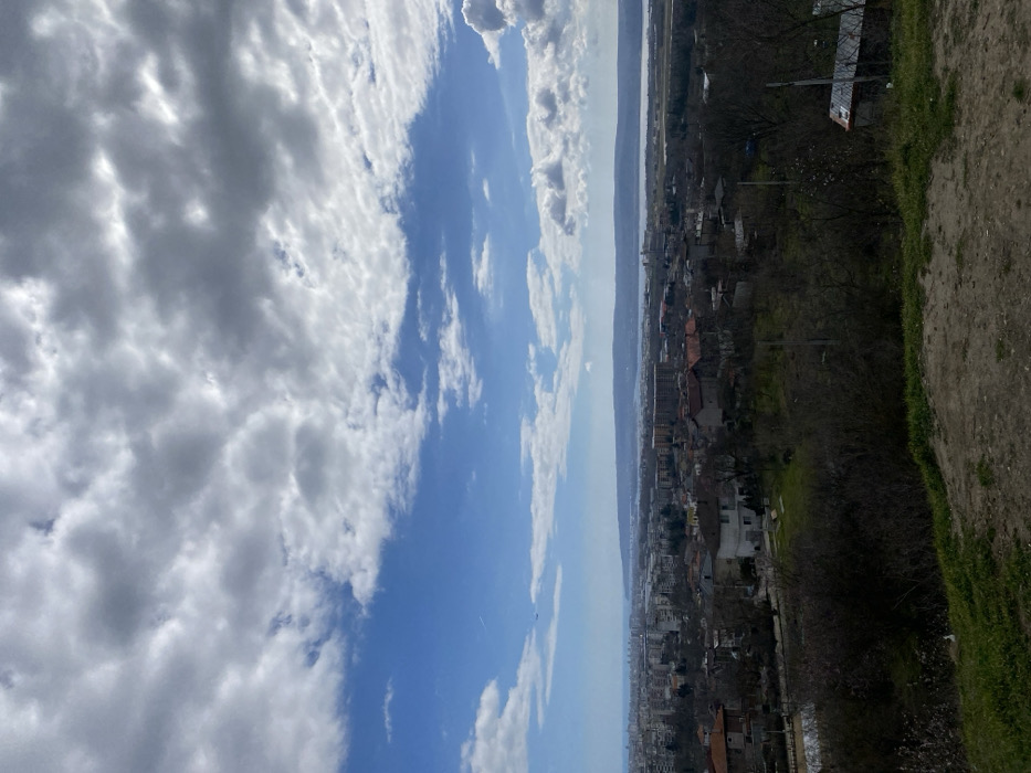 The image presents a panoramic, high-angle view of Varna, Bulgaria, under a partly cloudy sky. The upper half of the frame shows a dynamic sky, transitioning from bright blue patches to extensive areas of white and grey cumulus clouds, with a faint aircraft contrail visible in the upper-left quadrant. The midground encompasses the extensive urban landscape of Varna, featuring a dense arrangement of residential buildings; both multi-story apartment blocks and detached houses with reddish-brown tiled roofs are evident. Sparse, largely bare trees and bushes are integrated within the city fabric. Beyond the city structures, the Varna Bay and what appears to be Varna Lake stretch across the horizon. The foreground consists of an unpaved, sloping hillside, covered with sparse dry grass and exposed earthen patches, indicating an elevated viewpoint. Dense, leafless vegetation occupies the lower-midground, partially obscuring a small, metal-roofed, shed-like structure on the right. No individuals or specific activities are observable in the scene.