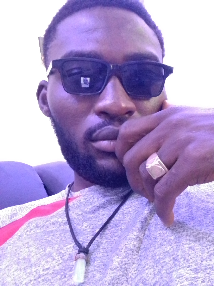 The image is a close-up selfie of an adult male with dark skin and a short beard