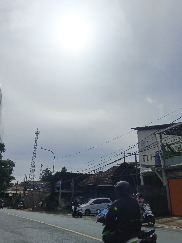 A daytime outdoor shot shows a street in a developing area. A tall, skeletal telecommunications tower stands near older buildings with tile roofs and an unfinished construction. A white car is parked near a house. Overhead power lines create a tangled network. Motorcyclists occupy the street with one passing in the foreground. The sun, high in the sky, is surrounded by a faint, colorful halo.