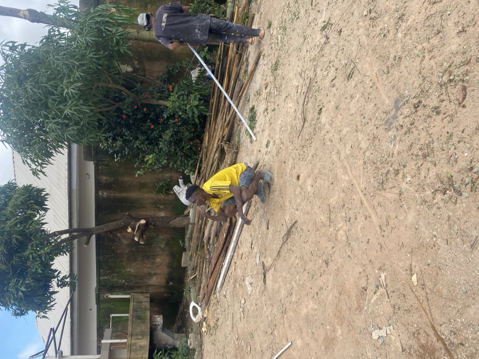 This image depicts an outdoor scene in Jos, Nigeria, featuring two adult males and various materials on a dirt ground