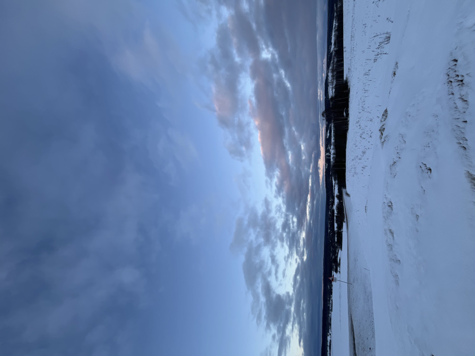 The image displays a panoramic winter landscape in the vicinity of Zubovo, Russia. The foreground and mid-ground consist of extensive, undulating terrain completely covered in white snow, with sparse, dark brown vegetation stalks protruding from the snowpack. A cleared asphalt road, dark in color, curves from the lower-left edge of the frame towards the center-right, descending into the distance. Adjacent to the left side of this road, a red-bordered, white triangular warning sign, partially obscured by snow, is visible. In the mid-distance, a dense, dark line of trees, appearing either deciduous and bare or coniferous, forms a prominent band across the horizon. Beyond these trees, a distant treeline is visible under a horizon line. The sky occupies approximately two-thirds of the upper frame, characterized by an overcast layer of blue-grey clouds with visible patches of lighter blue sky and subtle streaks of pink and orange hues, indicative of twilight conditions. No individuals, vehicles, or active human interactions are present in the scene.