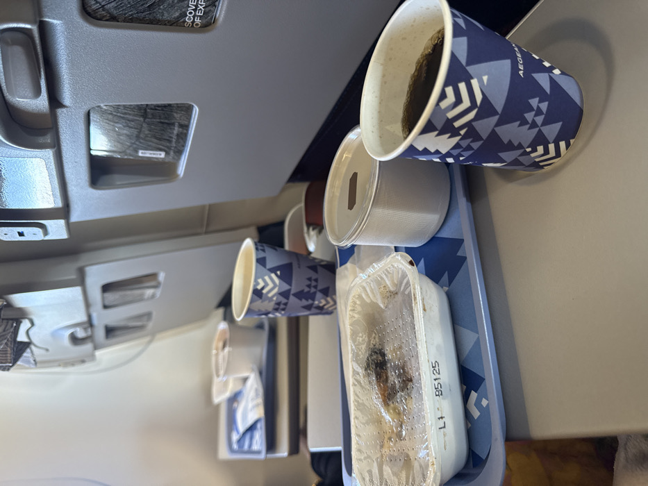 An airplane meal tray is shown on a grey tray table. The tray holds a sealed plastic container with food inside, a white container with a lid, and two paper cups with a blue geometric pattern. One cup appears to contain coffee. The overhead compartment is partially visible above the meal.