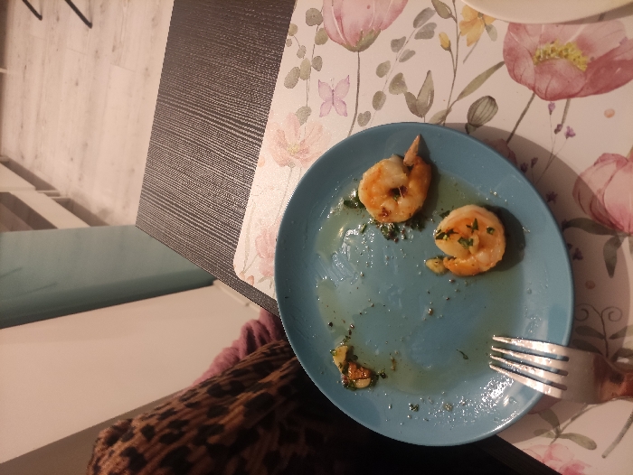 A light blue plate sits on a floral placemat. Two cooked shrimp, seasoned with herbs, rest on the plate, surrounded by oil and scattered herb pieces. A silver fork lies on the plate's edge. The placemat features a pattern of large pink flowers and green leaves. Part of a dark grey placemat is visible to the left, and a leopard print garment is seen in the bottom left corner.
