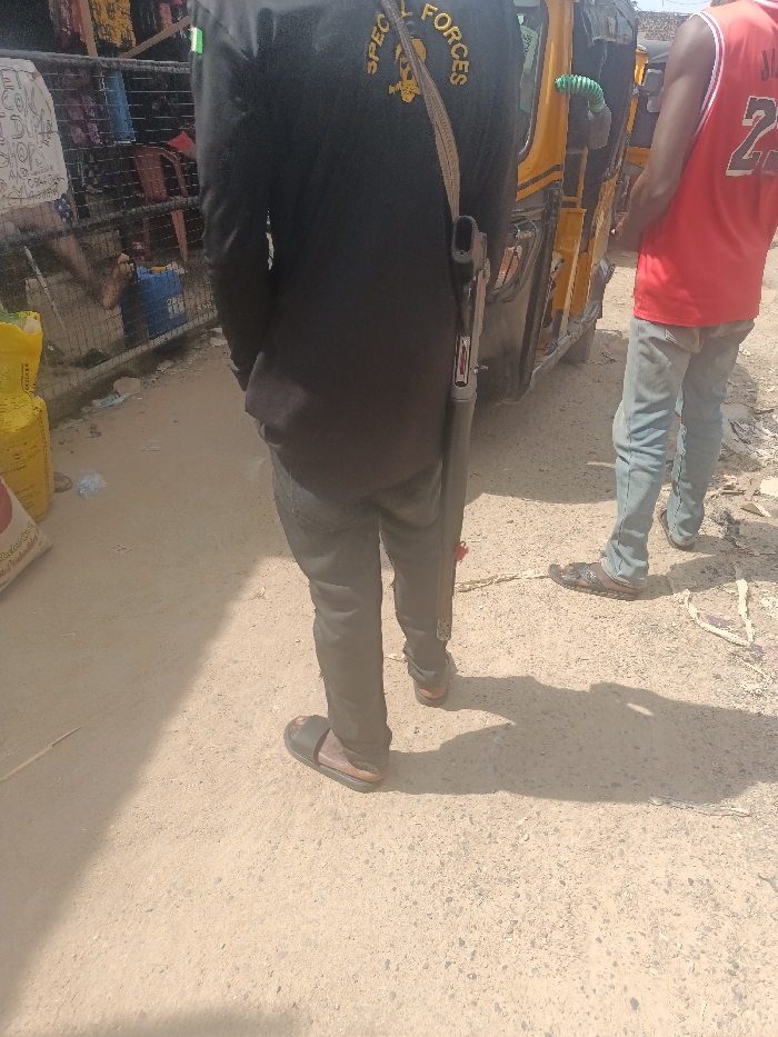 The image depicts an outdoor street scene in Unguwar Kaya, Nigeria, under direct sunlight. In the foreground, two individuals are seen from behind. The person on the left wears a black long-sleeved shirt with "SPECIAL FORCES" and a skull emblem in yellow text on the back, dark trousers, and black slide sandals. A long firearm, appearing to be a rifle or shotgun, is slung over their left shoulder, hanging down their right side, featuring a red object attached near the stock. The person on the right wears a red sleeveless jersey with the number "23" on the back, light blue jeans, and dark open-toed sandals. This individual is positioned next to a yellow commercial tricycle. The ground is composed of light brown dirt or sand. To the far left, a metal fence or barrier is visible, laden with hanging items, and yellow and white sacks are present at its base. Partial signage with the word "SHOPS" is discernible behind the fence. Strong shadows are cast on the ground, indicating bright daylight.